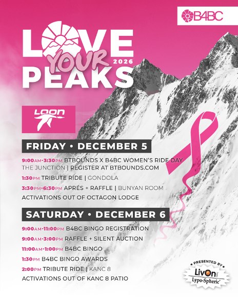 Love Your Peaks Loon will consist of a fun and impactful day of experiences including raffles and a silent auction with incredible partner prizes up for grabs, B4BC Bingo from 11 am – 1 pm, B4BC Bingo Awards at 1:30 pm and a Tribute Ride at 2:00 pm to honor those impacted by breast cancer. B4BC Bingo is an interactive activity where participants will pick up their bingo cards from the B4BC tent and go to stops sprinkled across the resort to get squares marked off. The first players marking off three spaces in a row get a chance to win fantastic prizes and those who complete the whole card will have an opportunity to win even bigger items. Registration is a $25 suggested donation which includes a B4BC beanie and can be found here.
