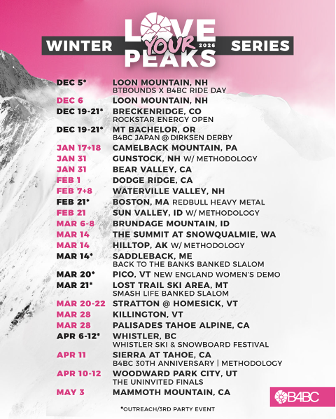 Jan 6, 2026 (Gardena, Calif.) – Boarding for Breast Cancer (B4BC) is thrilled to announce the official schedule for its beloved Love Your Peaks Winter Prevention Series presented by LivOn Labs. With 24 stops and outreach events planned for this season, while ringing in its 30th year of service, B4BC is committed to spreading its mission of a healthy, active lifestyle + early detection as the best means of breast cancer prevention to communities nationwide. The next stop of the series will be on January 17-18 at Camelback Mountain, PA.
