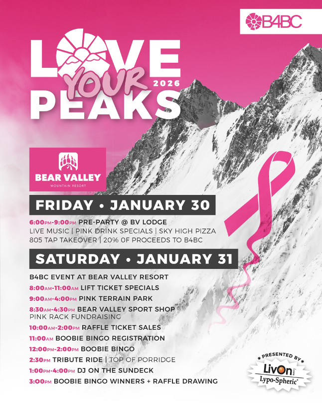 The Love Your Peaks Bear Valley Mountain stop kicks off on Friday, January 30 at 6 pm with a pre-party at Bear Valley Lounge. There will be live music, pink drink specials at Sky High Pizza and an 805 tap takeover with 20% of proceeds going towards B4BC’s fundraising goal.