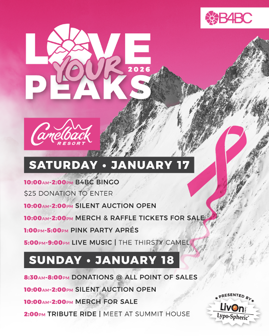 The Love Your Peaks Camelback Mountain stop kicks off on Saturday, January 17 at 10 am with B4BC Bingo, merch and raffle ticket sales. B4BC Bingo is an interactive activity where participants will pick up their bingo cards from the B4BC tent and go to stops sprinkled across the resort to get squares marked off. The first players marking off three spaces in a row get a chance to win fantastic prizes and those who complete the whole card will have an opportunity to win even bigger items. Registration is a $25 suggested donation which includes a B4BC beanie and can be found here.