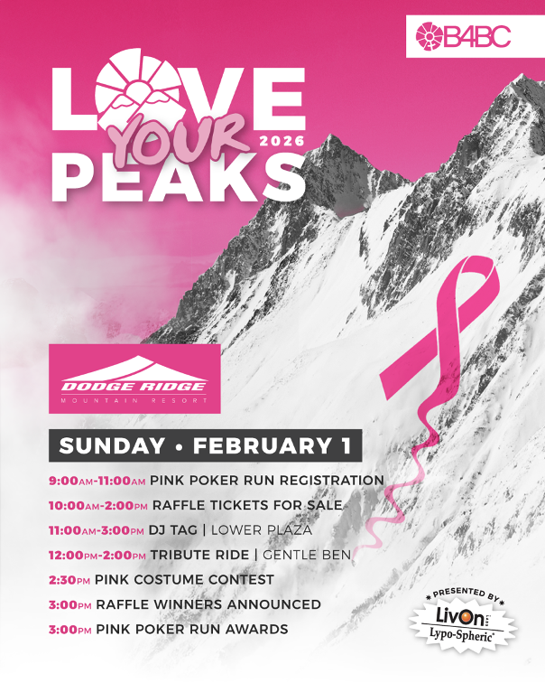 The Love Your Peaks Dodge Ridge Mountain Resort stop kicks off first thing on Sunday, February 1 and is a full day of activities supporting Boarding for Breast Cancer. All proceeds from the $89 Pink Lift Ticket, Poker Run, and Raffle go directly to B4BC. NorthFork Band will be rocking the base area from 12pm to 3pm. Before the day ends, gather at the top of Gentle Ben at 2:30pm for a Tribute Ride to honor those impacted by breast cancer. The fundraising starts now to reach the resort’s goal of $10k. Join the Dodge Ridge Fundraising Team here!